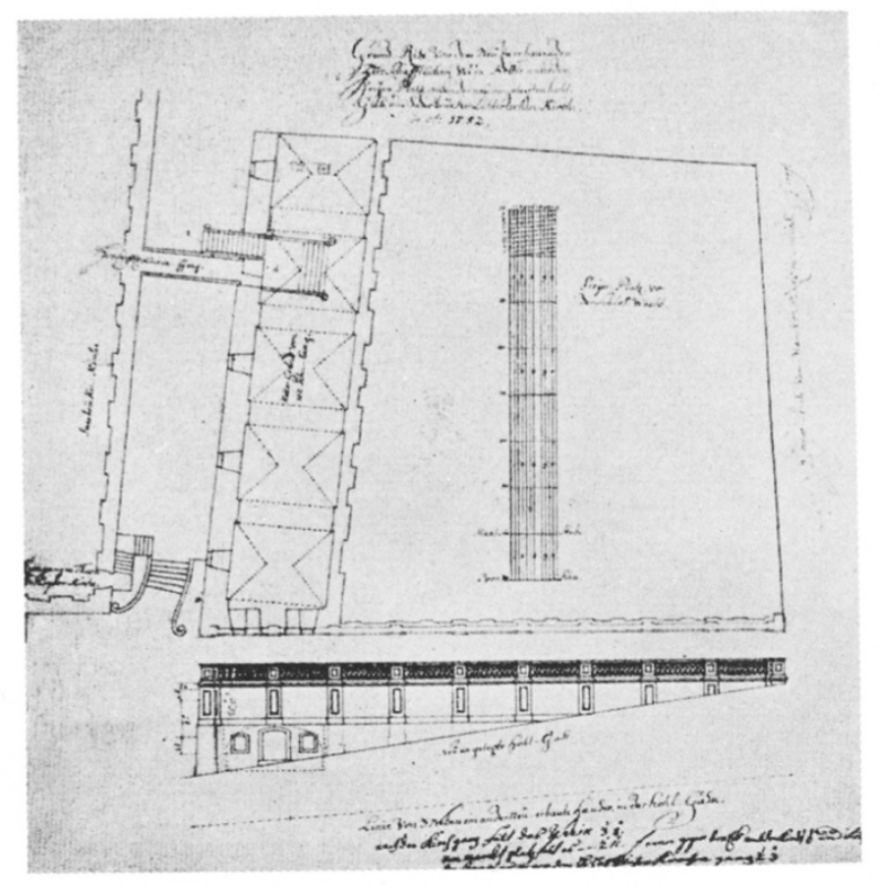 Vorstufe der ersten Rekonstruktionspläne unter Berücksichtigung der Bauaufnahme und der im Buchformat wiedergegebenen Ausführungspläne von Friedrich Joachim Stegel.