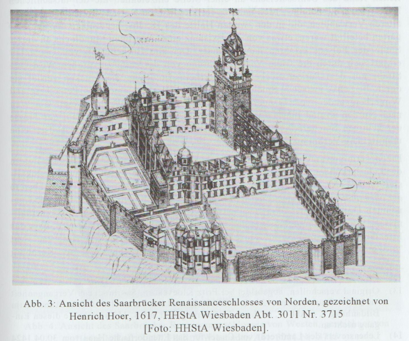 Barockschloss Saarbrücken Ostansicht Früher Vorentwurf - der Mittelpavillon hat an den Seitenflügel ein niedrigeres Mezzaningeschoss und keine Lisenengliederung (aus Lohmeyer 1937, Abb.47)