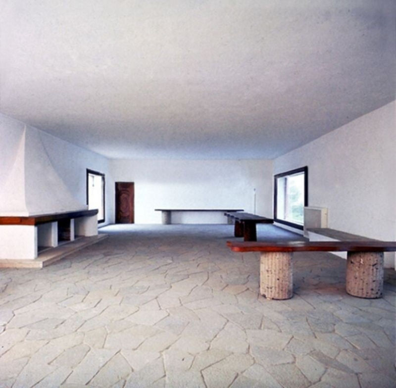 An einer Wand befindet sich ein großer Kamin und an einer anderen Wand ein großes Relief von Tazzini Pericle, einem Zeitgenossen von Malaparte, mit menschlichen Figuren verflochten, die an die erotischen Skulpturen an den Fassaden antiker Tempel von Kajuraho, Indien, erinnern.