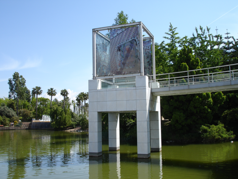 Die symbolische Architektur wird durch den um das Gebäude gelegten eingeschossigen halbkreisförmigen Annexbau mit dem Haupteingang, der Rezeption, dem Bücherladen und dem Teepavillon, welcher durch einen Wassergraben vom Hauptbaukörper getrennt und über offene und geschlossene Stege mit dem Hauptbaukörper verbunden. Den Teepavillon am Ende des halbkreisförmigen Ringbaues erreicht man vom Eingang aus über den Wandelgang des Foyers oder vom Hauptausstellungsgebäude über einen Brückensteg. Wände, Böden, Terrassen und Dächer des gesamten Gebäudes sind innen und außen mit weißem Marmor verkleidet. Die Glasfronten der Glaswände, und Oberlichter werden aus rahmenlosen Glaskonstruktionen gebildet. Zum Park hin wird der Kreisring des Annexbaues durch einen Lichtgraben vom Seeufer mit exotischen Pflanzen getrennt. Das Dach dieses Anbaues bildet eine begehbare Dachfläche, die zugleich als Ausstellungsfläche genutzt wird. In Verlängerung dieses Anbaues ragt aus dem See ein viereckiger zweigeschossiger Turm, gleich einem Signalturm, der durch einen Brückensteg mit diesem verbunden ist. Das Obergeschoss des Turmes besteht aus einem einfachen Stahlrahmen ohne Dach zur Aufnahme der textilen Werbesegel zu der jeweilig stattfindenden Wechselausstellung. Die Ausstellungsflächen werden durch das im See stehende Sockelgeschoss des Haupt- und Annexbaues ergänzt. Zugleich befinden sich die Werkstätten und Depots in diesem Untergeschoss.