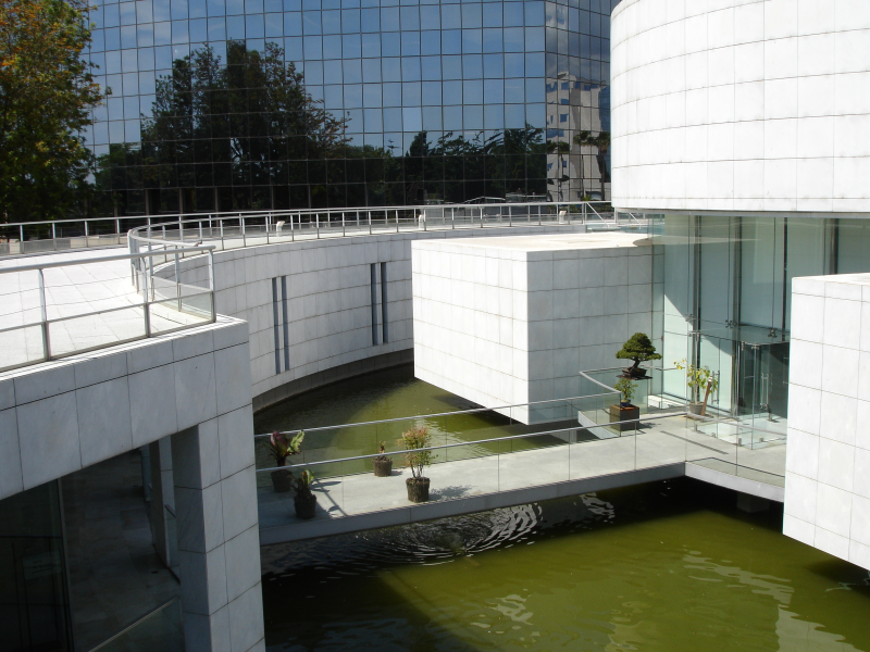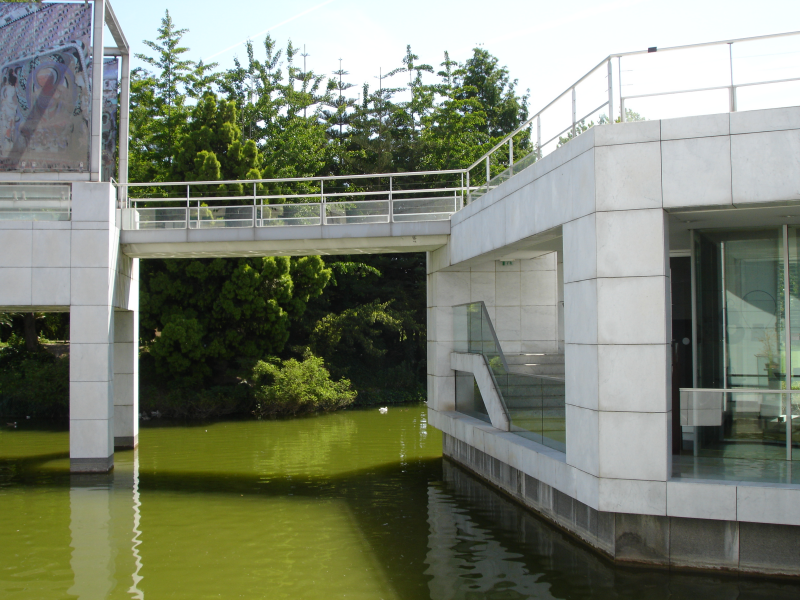 Die symbolische Architektur wird durch den um das Gebäude gelegten eingeschossigen halbkreisförmigen Annexbau mit dem Haupteingang, der Rezeption, dem Bücherladen und dem Teepavillon, welcher durch einen Wassergraben vom Hauptbaukörper getrennt und über offene und geschlossene Stege mit dem Hauptbaukörper verbunden. Den Teepavillon am Ende des halbkreisförmigen Ringbaues erreicht man vom Eingang aus über den Wandelgang des Foyers oder vom Hauptausstellungsgebäude über einen Brückensteg. Wände, Böden, Terrassen und Dächer des gesamten Gebäudes sind innen und außen mit weißem Marmor verkleidet. Die Glasfronten der Glaswände, und Oberlichter werden aus rahmenlosen Glaskonstruktionen gebildet. Zum Park hin wird der Kreisring des Annexbaues durch einen Lichtgraben vom Seeufer mit exotischen Pflanzen getrennt. Das Dach dieses Anbaues bildet eine begehbare Dachfläche, die zugleich als Ausstellungsfläche genutzt wird. In Verlängerung dieses Anbaues ragt aus dem See ein viereckiger zweigeschossiger Turm, gleich einem Signalturm, der durch einen Brückensteg mit diesem verbunden ist. Das Obergeschoss des Turmes besteht aus einem einfachen Stahlrahmen ohne Dach zur Aufnahme der textilen Werbesegel zu der jeweilig statt findenden Wechselausstellung. Die Ausstellungsflächen werden durch das im See stehende Sockelgeschoss des Haupt- und Annexbaues ergänzt. Zugleich befinden sich die Werkstätten und Depots in diesem Untergeschoss.